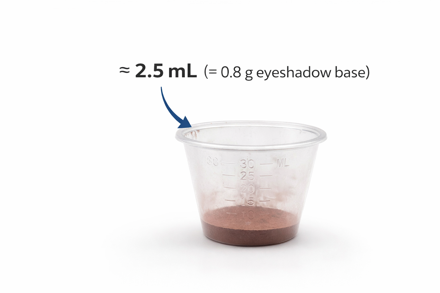 4. Standardize your base. If you have a small zip bag, it contains one pre-measured portion of base (0.8g) — this is one full eyeshadow. If you have a large zip bag containing 2.4g, measure out one third of the base into your first mixing cup. This is a good opportunity to coordinate with classmates. If you would like to work with a different base color, now is the time to trade or share portions with a classmate before opening any mica.